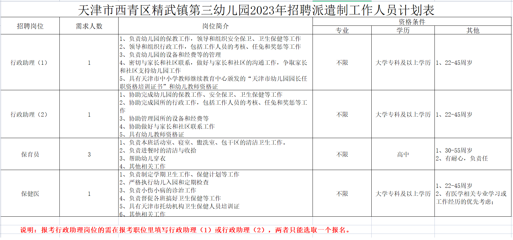 具体的招聘岗位、资格条件等详见《2023年天津市西青区精武镇第三幼儿园公开招聘编外工作人员计划表》(见附件)